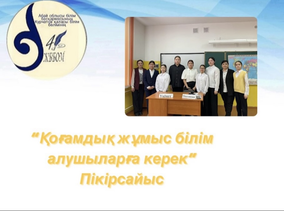 Мектебімізде 2024 жыл 3 сәуір "Қоғамдық жұмыс білім алушыларға керек деп есептейміз" тақырыбында 7 А сынып оқушыларының арасында пікірсайыс өткізілді. Пікір сайыс кезінде оқушылар қоғамдық жұмыстарға қатысу арқылы бос уақыттарын тиімді өткізіп, тәжірибе жинауға мүмкіндіктері көп екендігі туралы талқыланды. Дебатқа мектебіміздің тәлімгері Мухтарова Н. Б. мен психолог Каримова А.Б. төрешілік етті.