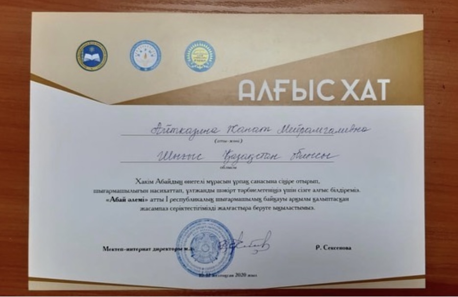 Құттықтаймыз! Жалпы білім беру ұйымдарының оқушылары арасында өткен «Абай әлемі» атты І республикалық шығармашылық байқауына қатысып ІІІ дәрежелі дипломға ие болған 9 «А» сынып оқушысы Дамуқан Мұрагерді құттықтаймыз! Жетекшісі: Айтказина Жанат Мейрамғалиевна.