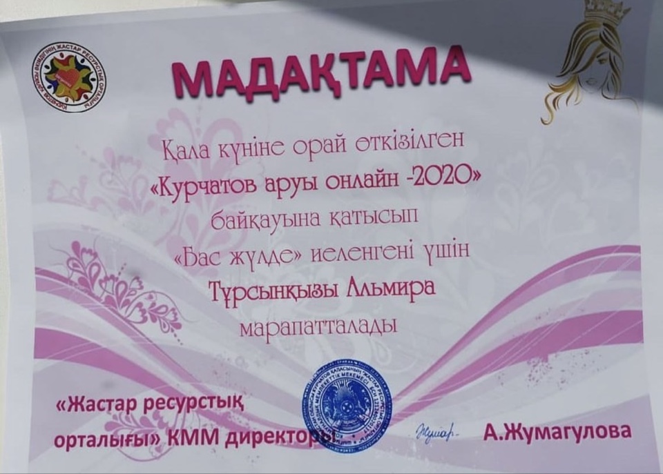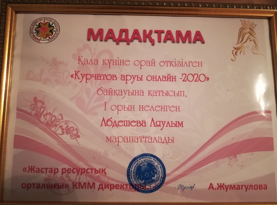 Құттықтаймыз! Қала күніне орай өткізілген "Курчатов аруы онлайн - 2020" байқауында мектебіміздің оқушылары қатысып, екі жүлделі орынды қанжығаларына байлады. Тұрсынқызы Альмираны "Бас жүлдемен", Абдешева Аяулымды І орынды иеленгені үшін құттықтаймыз!