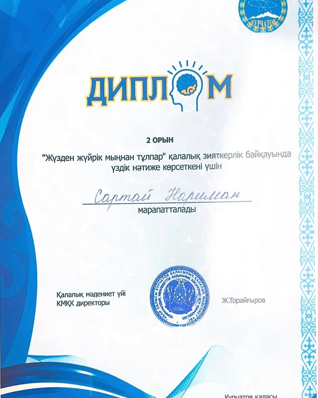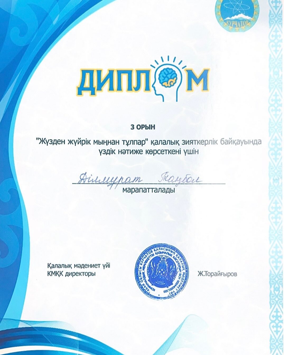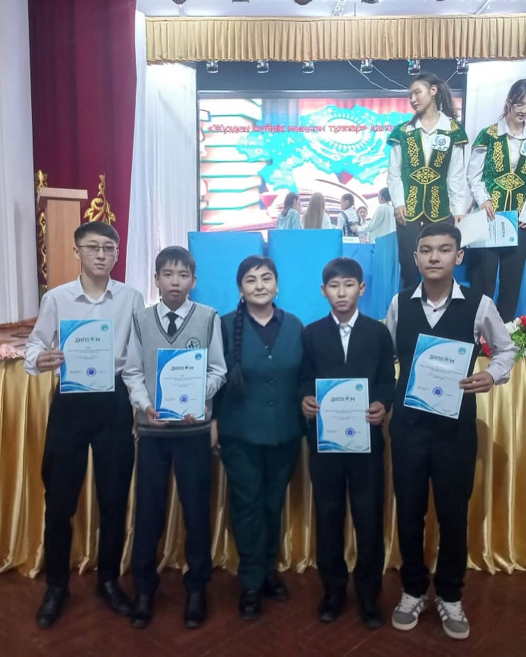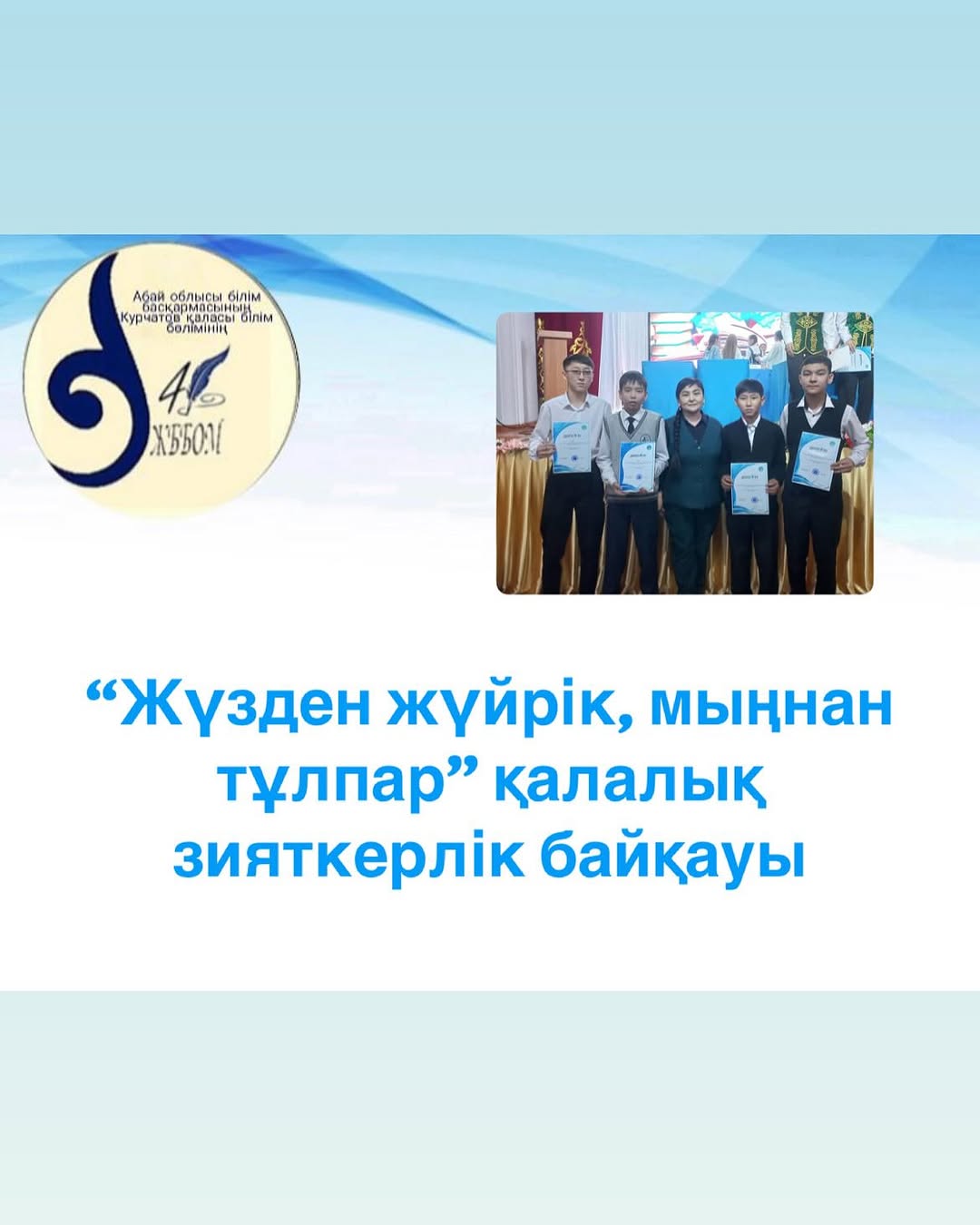 06.11.2024ж. Қалалық мәдениет үйінде “Жүзден жүйрік, мыңнан тұлпар”қалалық зияткерлік байқауына мектебіміздің 8 сынып оқушылары қатысып Рауанұлы Ерсұлтан- бас жүлде, Сартай Нариман-2 орын, Ділмұрат Таңбол-3 орынға ие болды.