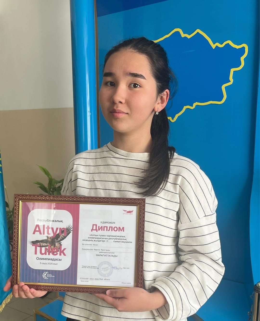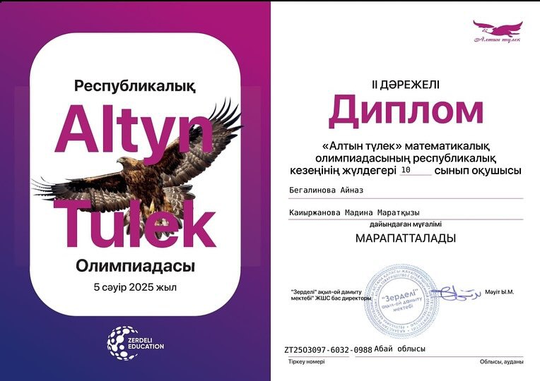 Жалпы білім беретін мектептердің оқушыларын қолдау, жоғары сынып оқушыларын ғылымға баулу, сондай - ақ педагогикалық және инженерлік - техникалық мамандықтарға қызығушылықтарын арттыру мақсатында “Алтын түлек” математикалық олимпиадасының республикалық кезеңі өтті. Олимпиадада мектебіміздің 10 ”А” сынып оқушысы Бегалинова Айназ жүлделі 2 орынды иеленді. Құттықтаймыз! Жетекшісі: математика, информатика пәндері мұғалімі,педагог - зерттеуші Каиыржанова Мадина Маратовна