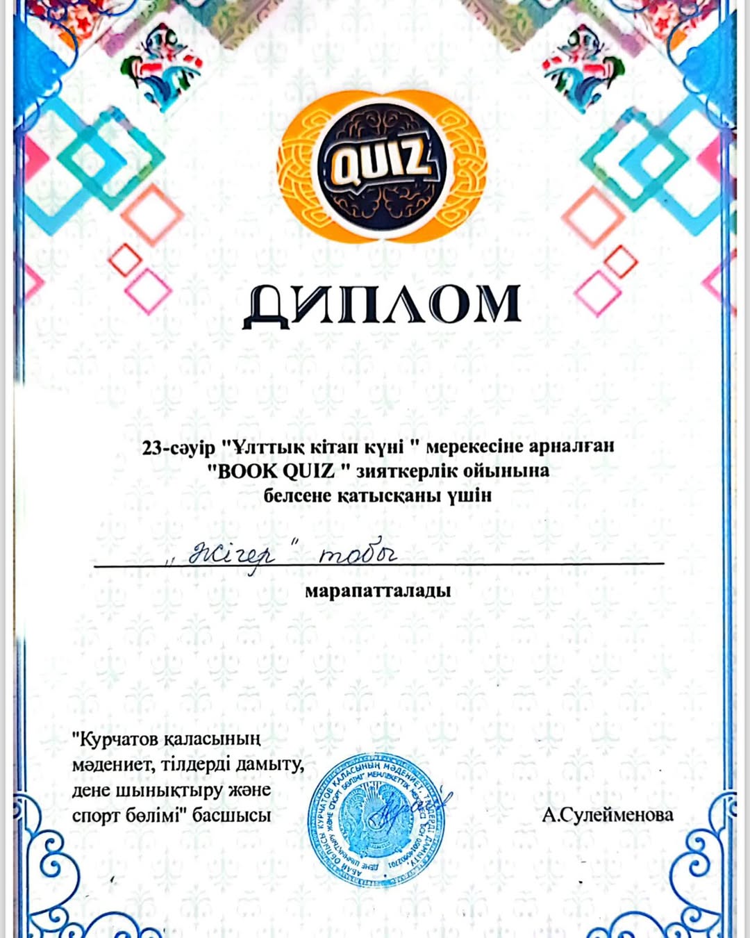 2025 жылдың 23 сәуір күні Қалалық мәдениет үйінде Ұлттық кітап күніне орай “BOOK QUIZ” атты қалалық зияткерлік байқау өтті. Аталған іс - шараға 4 жалпы білім беретін орта мектептің атынан “Жігер” командасы қатысты. Ойын 7 кезеңнен тұрды. Ойын барысында 2025 жылғы мерейтойларға байланысты сұрақтар қойылып, біздің ұстаздар белсенділік танытып марапатқа ие болды.