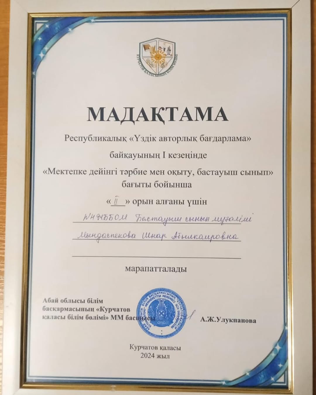 «Үздік авторлық бағдарлама» байқауының қалалық кезеңінде “Мектепке дейінгі тәрбие мен оқыту, бастауыш сынып” бағыты бойынша мектебімізден бастауыш сынып мұғалімі Мындаспекова Ш.А. қатысып, “Фонетика әлемі” тақырыбында өз тәжірибесімен бөлісіп ІІ орынға ие болды.