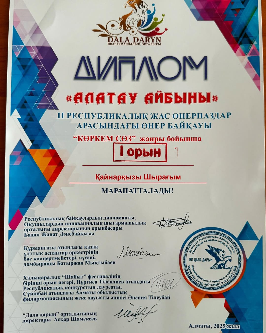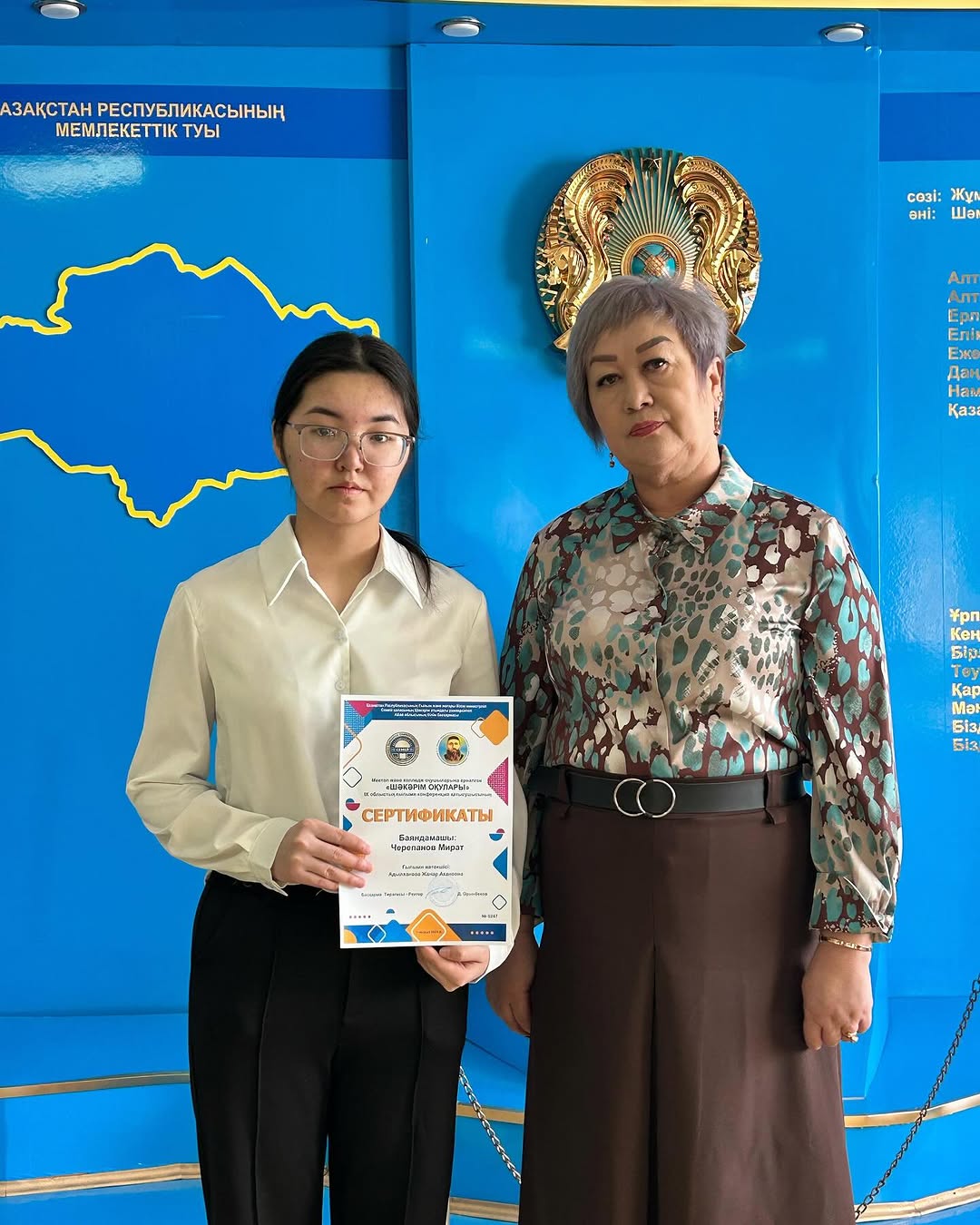 Ғылыми конференцияға секция орыс филология 11 сынып оқушысы Черепанов Мират және 11 сынып оқушысы Дакебаева Назерке қатысты. Конференция қорытындысы бойынша Черепанов Мират ІІІ дәрежелі дипломмен және бағалы сыйлық пен марапаттады. Барлык қатысушылар сертификаттармен марапатталды.