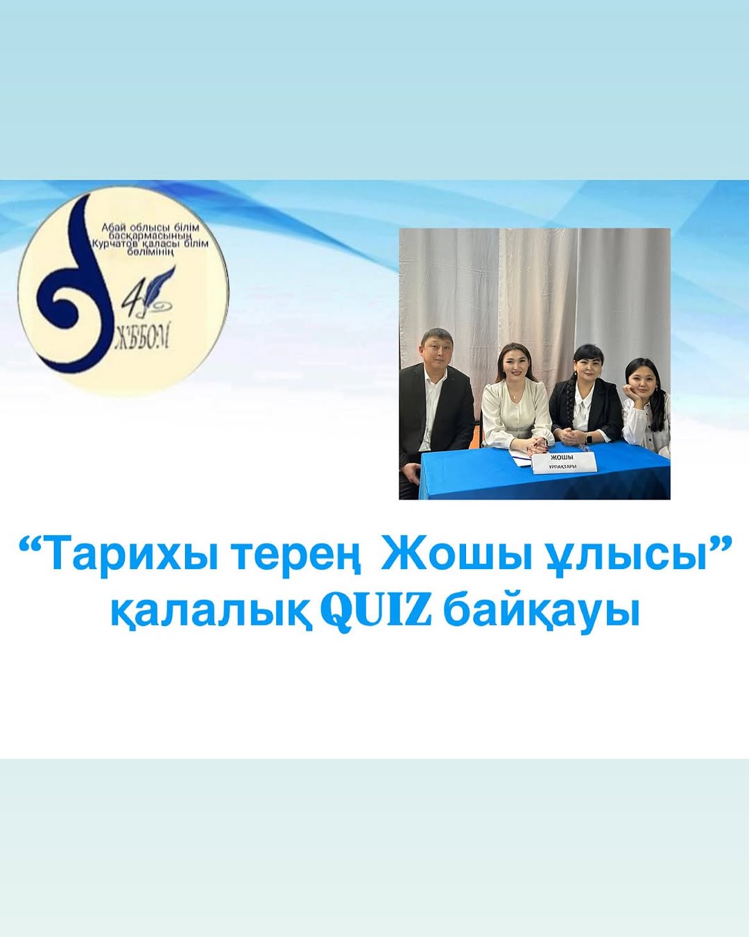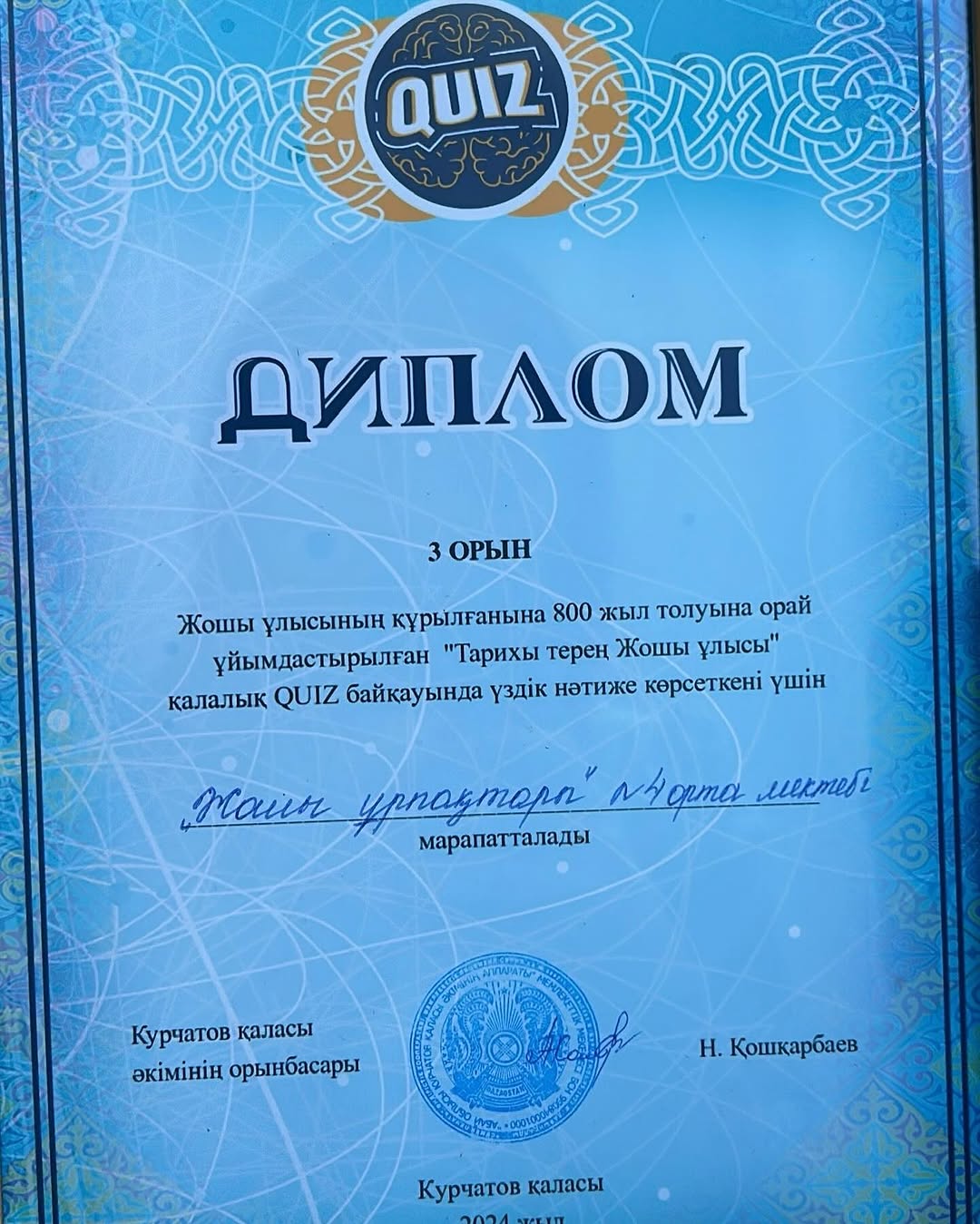 Жошы ұлысының құрылғанына 800 жыл толуына орай ұйымдастырылған қалалық “ Тарихы терең Жошы ұлысы” атты QUIZ байқауында “”№4 ЖББОМ” коммуналдық мемлекеттік мекемесінің “Жошы ұрпақтары” командасы 3-ші орынды иеленіп, марапатталды.