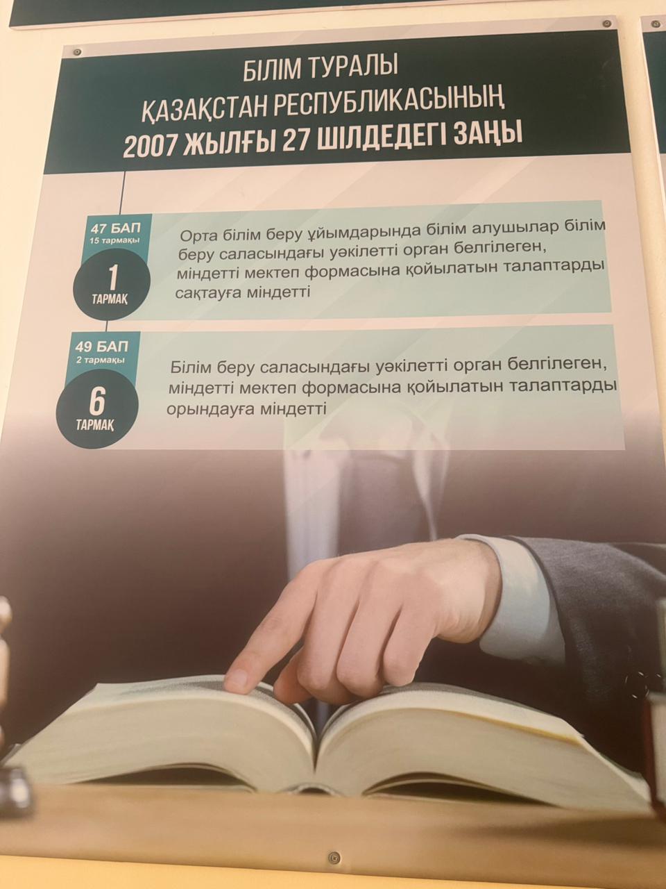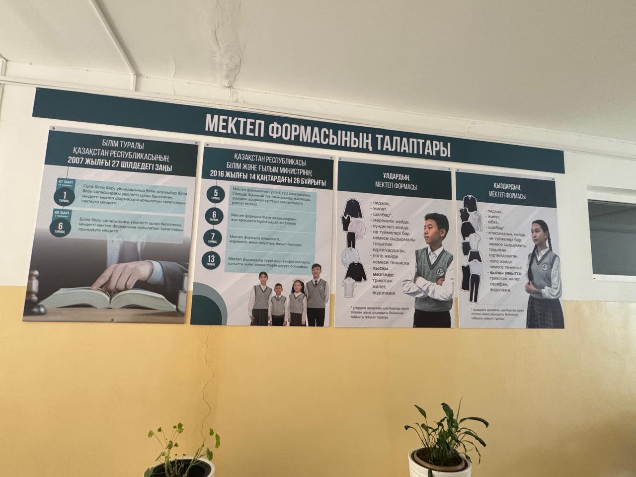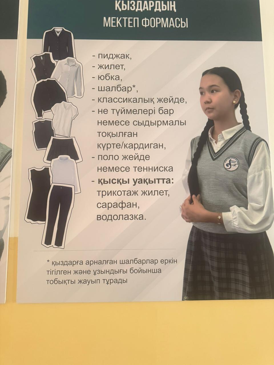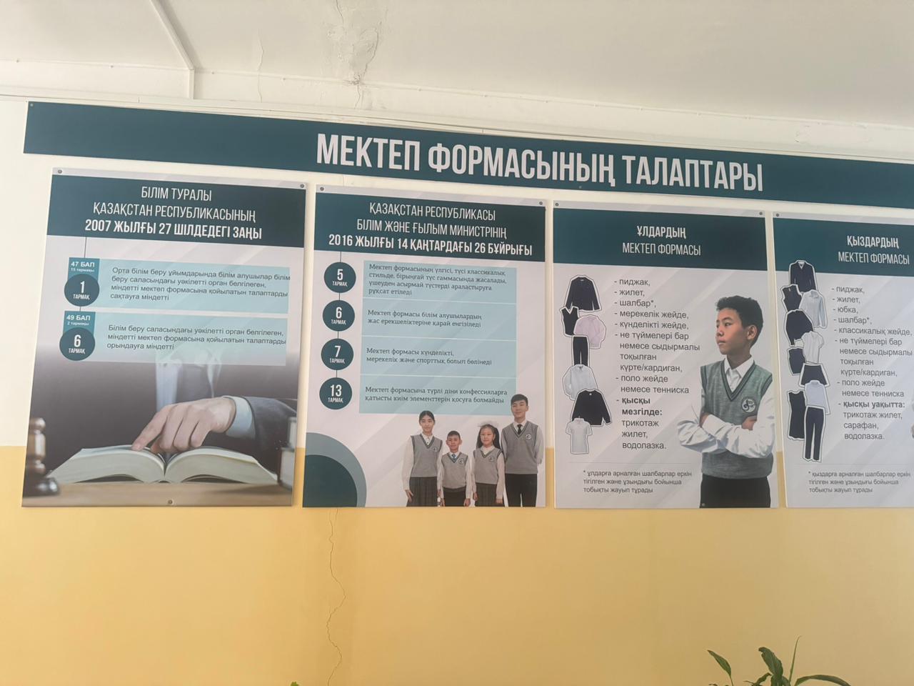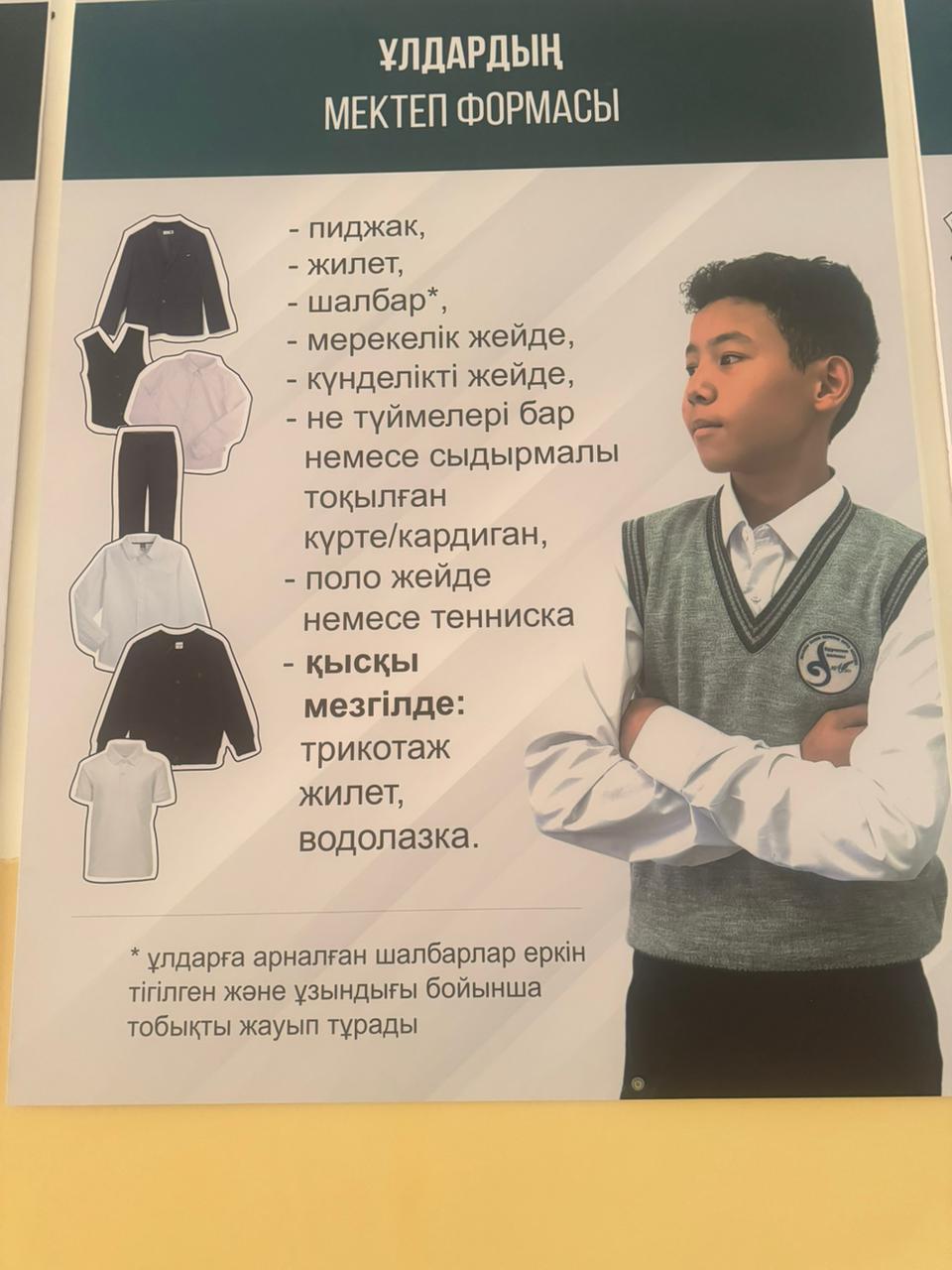Мекемеде әртүрлі конфессиялардың діни тиесілілігіне байланысты киімдер немесе діни атрибуттармен безендірілген басқа да киімдерді киюге тыйым салынады. Міндетті мектеп формасына сәйкес келмейтін немесе білім беру ұйымының Жарғысына және оның ішкі тәртіп ережелерін бұзатын бас киімдер, бұйымдар немесе киім элементтерінің кез келген түрін киюге тыйым салынады. Бас киім киюге тыйым салуды объективті себептер (ауру, жарақат) құрайды. Аталған оқушылардың мекемеге баруына медициналық мекеменің анықтамасы немесе емдеуші дәрігердің ұсынымы болған жағдайда жол беріледі.